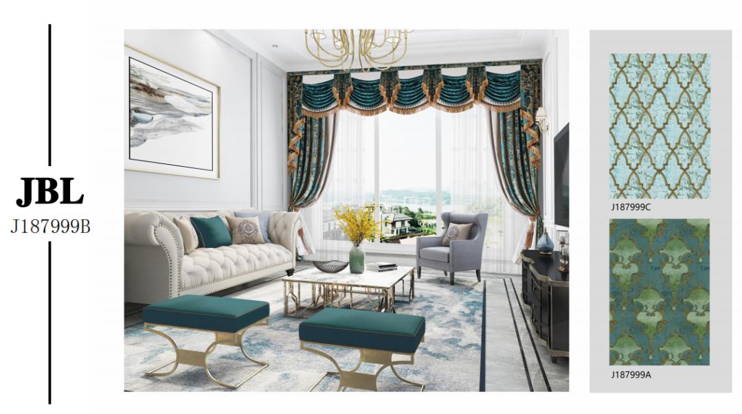 优雅复古的绿,精致的花边,为空间营造出华丽而典雅的氛围,自然流露出华贵优雅的气质,简约的水波,精美而不繁琐,底布手绘渐变,整体画面呈碎金效果,影影绰绰,演绎低调的奢华,用现代时尚工艺诠释复古的经典。